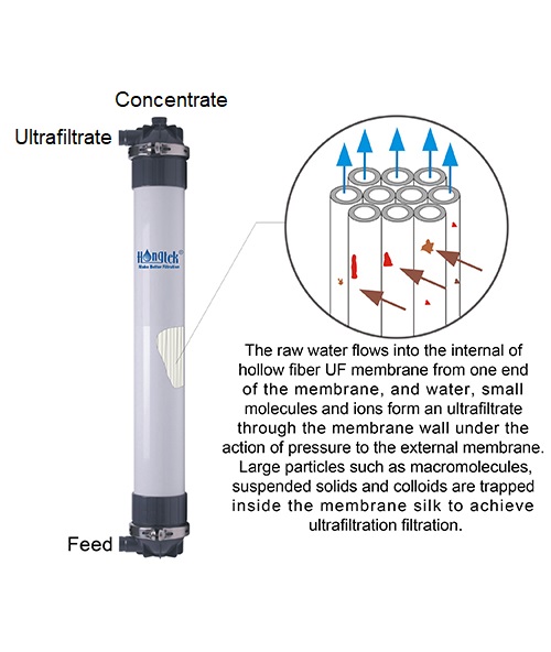 ● Die Filterfeinheit der PVDF-UF-Membran beträgt 0,1 Mikrometer, Partikel werden von der Membranwand eingefangen